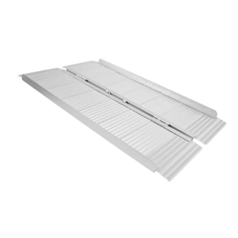 Rampe aus Aluminium mit geriffelter Oberfläche und Tragegriff. Die Rampe ist längs klappbar, wodurch sie leicht zu bewegen und zu transportieren ist.