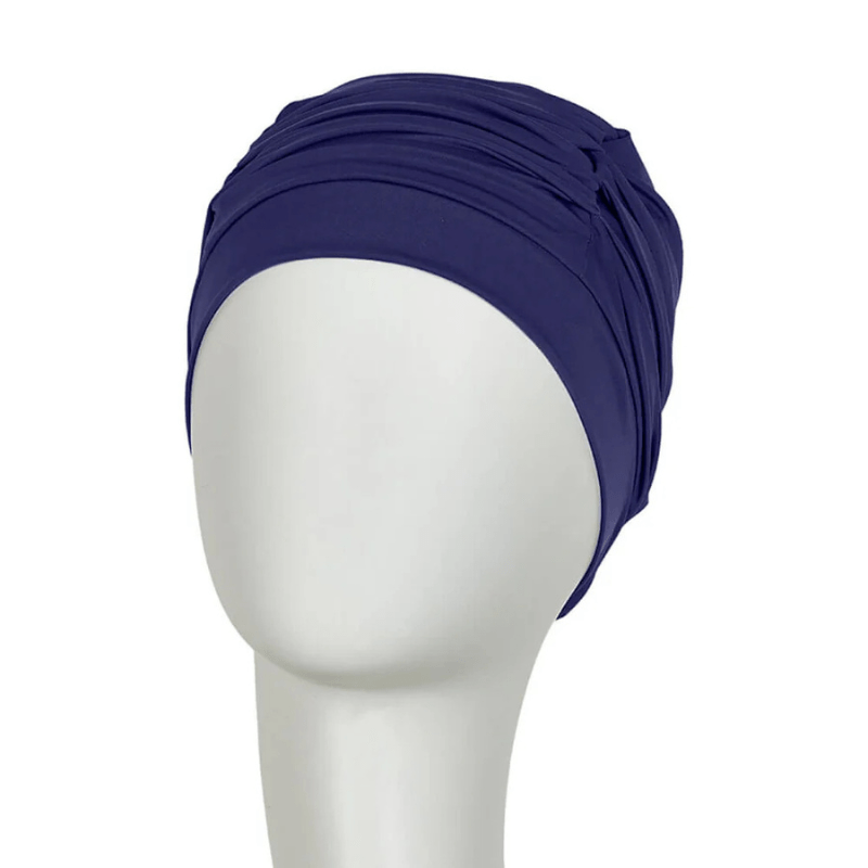 Den smukke rynkeeffekt på huen tilfører perfekt volumen til hovedet, og huen strammer ikke som en almindelig badehætte. Det bløde materiale er let, absorberer ikke vand og tørrer hurtigt.