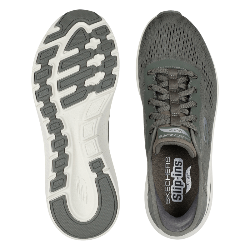 Fleksibel og let slip-in damesneaker fra Skechers i olivenfarvet tekstil med vandtæt membran og Arch Fit teknologi, som giver målrettet svangstøtte.
