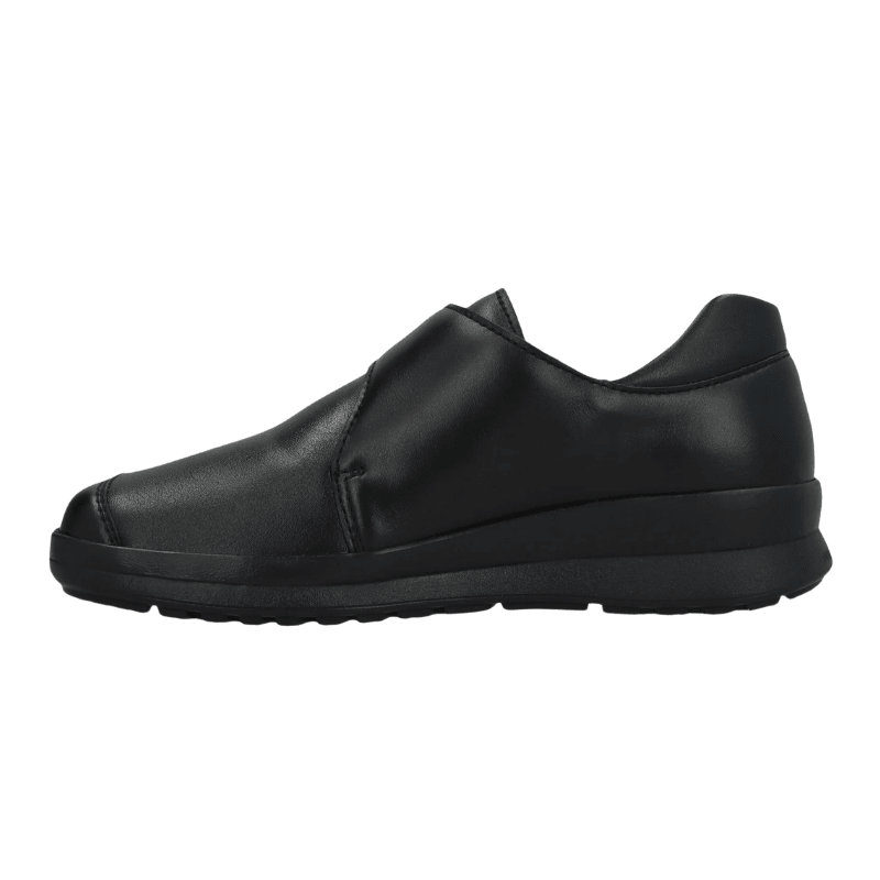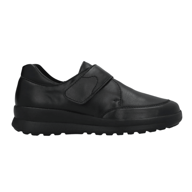 Schwarze Berkemann-Schuhe aus weichem Leder mit Textilfutter, das sowohl komfortabel ist als auch Atmungsaktivität für den Alltag bietet. Der Schuh wird mit einem verstellbaren Klettverschluss geschlossen, damit du die Passform einfach an deinen Fuß anpassen kannst.