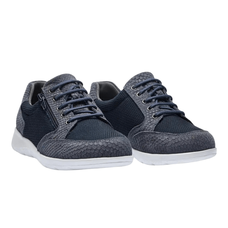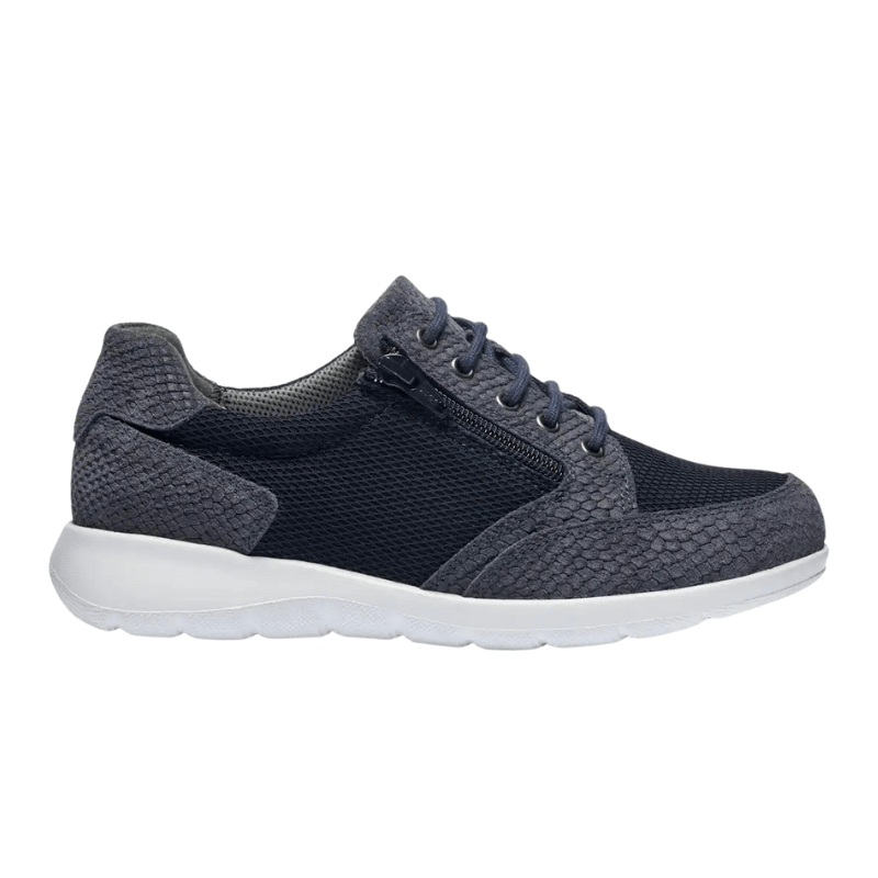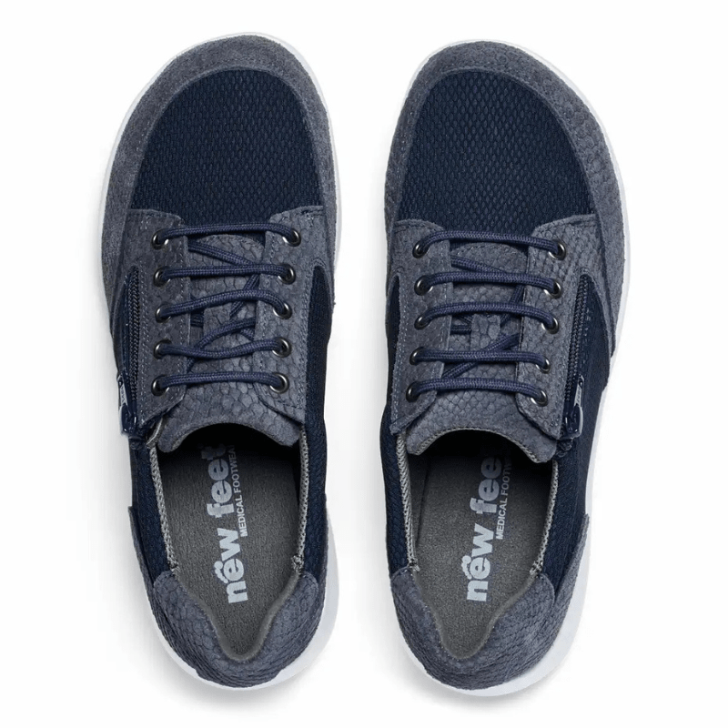 Eleganter dunkelblauer Sneaker von New Feet aus einer Kombination von Wildleder und Textil mit schicken schlangenähnlichen Details. Der Schuh hat sowohl Schnürsenkel als auch einen Reißverschluss, sodass er leicht an- und auszuziehen ist und sich in der Passform anpassen lässt.